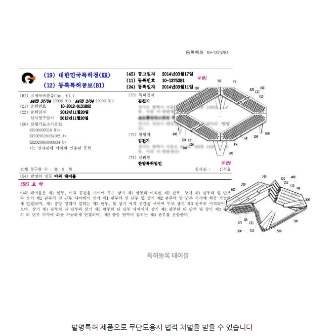발명특허 제품으로 무단 도용 및 무단 판매시 법적 처벌을 받을 수 있습니다.